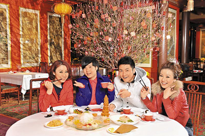 ■(左起)迪子、葉文輝、高皓正及張靈齊齊品嚐香宮賀年菜團年。