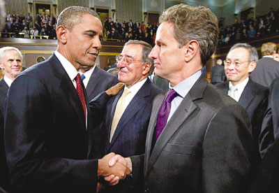 ■奧巴馬發表國情咨文後,與蓋特納(右)握手。法新社