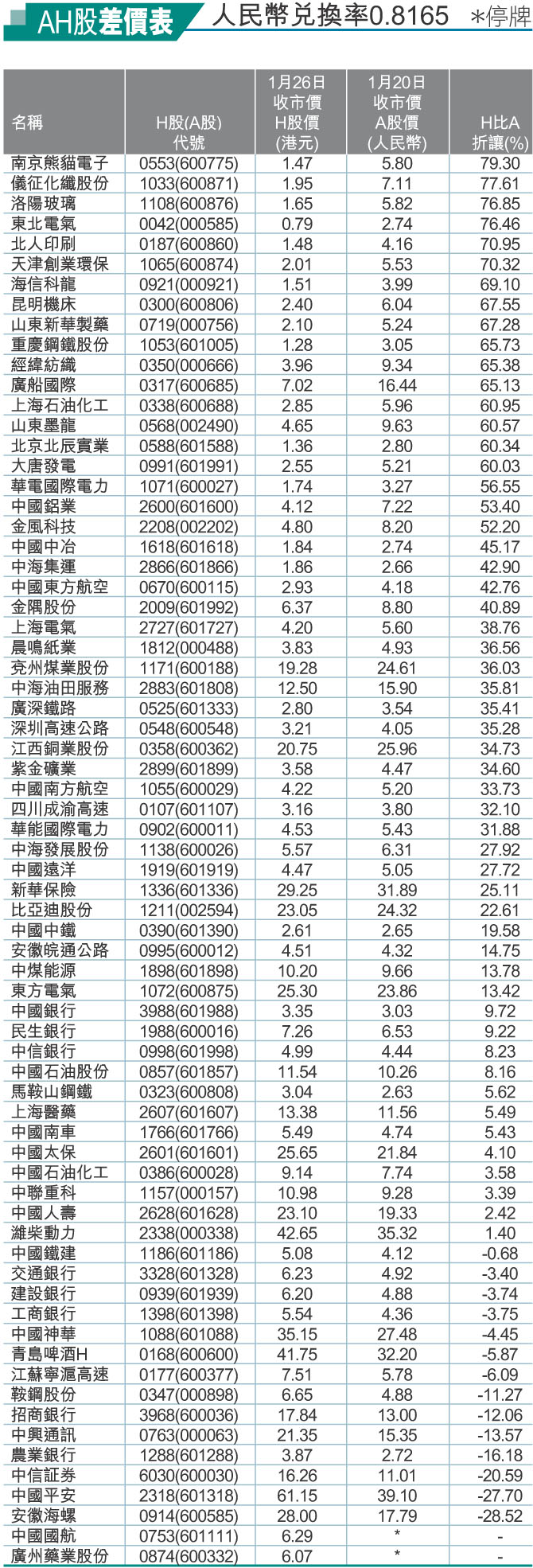 AH股差價表(人民幣兌換率0.8165)*停牌 (2012-01-27) (圖)