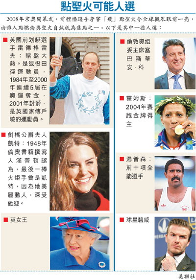 ■ 劍橋公爵夫人凱特:1948年倫奧書籍撰寫人漢普頓認為,最後一棒火炬手會是凱特,因為她美麗動人,深受歡迎。