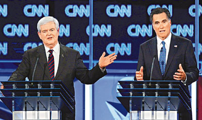 ■金里奇(左)和前麻省州長羅姆尼(右)辯論。美聯社
