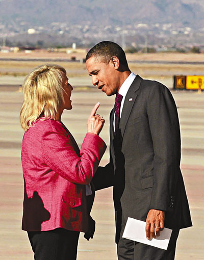 美國總統奧巴馬周三飛抵亞利桑那州鳳凰城,共和黨籍州長布魯爾前來接機,電視鏡頭前只見兩人親切握手,但有媒體披露他們甫見面就發生了不愉快的「摩擦」,並刊出布魯爾的手指指向奧巴馬面部及看似破口大罵的照片。事件成為各方話題,奧巴馬形容事情「沒大不了」,暗指共和黨人藉與他爭拗博宣傳。