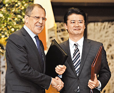 俄羅斯外長拉夫羅夫(圖左)昨日訪問日本,與日本外相玄葉光一郎(圖右)會談。雙方共同宣布,兩國同意在經濟與安保領域加強合作,並在會後簽署簡化日企相關人員赴俄簽證手續的協議,但雙方未能就南千島群島(日稱北方四島)歸屬問題取得進展。