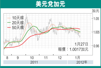 另一方面,美國聯儲局在上周表示會維持超低息水平至2014年底後,不排除與美元相關的利差交易活動將會逐漸增加,這亦對加元構成支持作用。雖然惠譽上周將意大利以及西班牙等5個歐元區國家的債信評等下調,但市場傳出希臘的減債談判快將達成協議後,投資者在上周已傾向進一步回補歐元空倉盤,因此受到歐元於上周尾段向上衝破1.3200美元主要阻力關位的帶動下,連帶商品貨幣的反彈幅度亦持續擴大,該情況亦有助加元的短期表現。由於美國上月的就業數據有所改善,市場已頗為關注美國本周五公布的1月份就業數據是否能繼續好轉,所以若果該數據一旦是較預期好,則商品貨幣將會保持近期的偏強走勢,故此預料加元將反覆走高至0.9900水平。