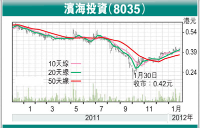 濱海投資較早前公布截至去年9月止半年度,集團營業額增長65.8%至8.03億元,股東應佔溢利大幅增長至4,024萬元。期內來自管道燃氣銷售的營業額增長為1.2倍至2.03億元,分部溢利增長5.4倍至2,009萬元;至於接駁服務的營業額增長9.3%至7,424萬元,分部溢利微減3.6%至4,247萬元。集團之前獲得7年期的銀團貸款,市場正關注其稍後可能向母公司進一步注入資產的行動。從該股近日持續走高,昨高位的0.425元已逼近近期高位阻力的0.43元,反映已有「醒目錢」密密收集。若股價短期升破0.43元阻力,中線目標將上移至0.6元。此外,濱海投資正積極部署轉主板,也成為受捧因素。