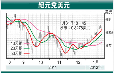 另一方面,除了英國及捷克之外,歐盟其他成員國已同意在3月份簽訂收緊財政紀律的新協定,因此為了增加市場對歐元區的信心,不排除歐洲央行現階段將會繼續大力吸納歐元區債券以壓低債息。雖然部分投資者已認為歐洲央行早晚要進一步降息以避免歐元區經濟陷入衰退,但受到希臘的無序違約風險已下降以及歐元對美元現時依然是抱有息差優勢的情況下,預期歐元的反彈將對商品貨幣的表現構成正面影響,故此預料紐元將反覆走高至83.80美仙水平。