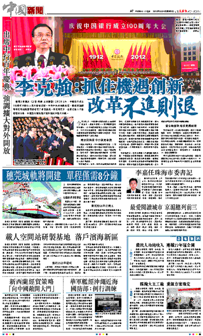 今年2月5日,中國銀行將迎來成立100周年紀念日,成為中國唯一一家持續經營百年的銀行。今日的慶典距離正式紀念日只有兩天。中共中央候補委員、國務院常務副秘書長尤權宣讀溫家寶總理給中國銀行的賀信。李克強副總理發表了重要講話。