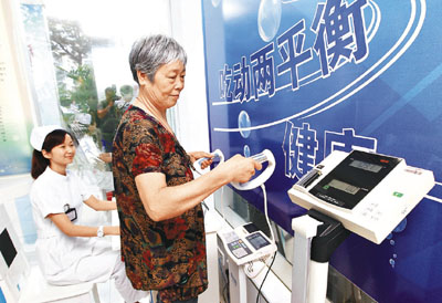 ■持有健康卡的上海社區居民在一個健康自測小屋內檢查脂肪率。 資料圖片