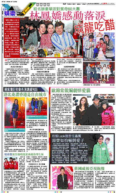 父親成龍專程從日本飛台灣出席妻子的壽宴,他笑說:「林鳳嬌是個很幸福的女人,有兩個男人在外拚命地為她賺錢。」其後一家3口難得開心合照,連祖名也不禁謂:「這是自爺爺走後7年來,我們全家首次合照。」