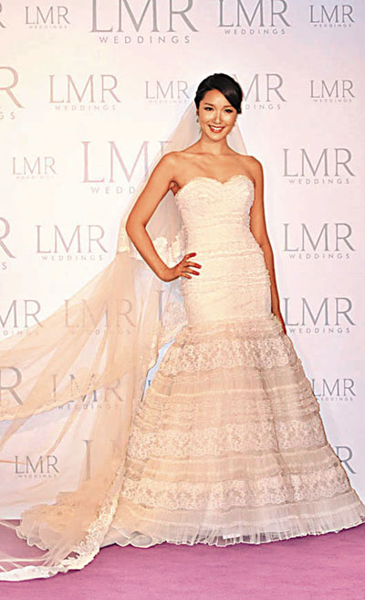 李亞男穿上Pronovias魚尾蕾絲設計婚紗,帶上長而飄逸的頭紗,更顯其高貴的氣質。