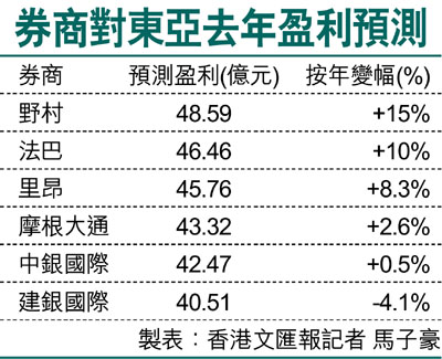 以全年業績計,以野村的預測最為樂觀,料其全年多賺15%至48.59億元;建銀國際則看淡,認為東亞業績將錄得倒退,少賺4.1%至40.51億元。