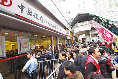 ■中銀啟田道分行,擠滿了排隊等候購鈔的人群。