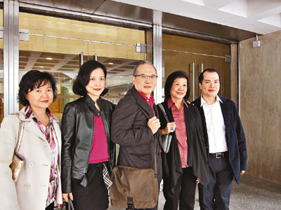 ■甘家第三代成員甘連宏(右一)昨完成作供與家人一字排開讓記者拍照。