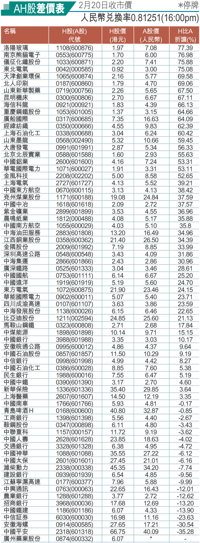 AH股差價表(2月20日收市價)*停牌 (2012-02-21) (圖)