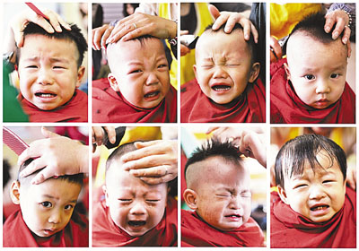 昨日是農曆二月初二,民間有「二月二,龍抬頭」的說法。為討好綵頭,許多家長帶颿臚l到理髮店理髮。圖為小朋友們「剃龍頭」的場景。 新華社