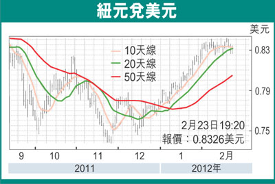 另一方面,德國Ifo指數從1月份的108.3攀升至2月份的109.6之後,該指數已是連續4個月上升,並且反映德國企業的信心已是持續增強,所以連帶歐元兌美元匯價亦一度於本周四反覆走高至1.3340附近的兩個多月來高位。由於歐元兌美元已向上衝破了近期位於1.3320附近的主要阻力位,因此市場氣氛將可能會進一步利好歐元,該情況將對商品貨幣的表現構成正面影響,這亦較為有助紐元的短期表現,故此預期紐元將會續有反覆空間。此外,日圓近期的持續轉弱已導致紐元兌日圓交叉匯價於本周初反覆上揚至67.30附近的6個多月來高位,故此受到紐元兌日圓交叉盤走勢偏強的帶動下,預料紐元將反覆走高至84.60美仙水平。