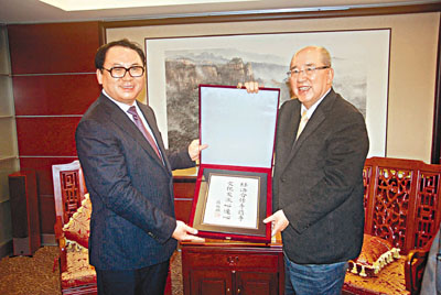 ■吳伯雄(右)贈送自己的書法作品「經濟合作手攜手 文化交流心連心」予都本偉。香港文匯報記者沈立炯 攝