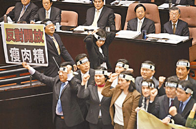 香港文匯報訊 綜合報道:台灣第八屆「立法院會」第一會期昨天(24日)上午首度開議,卻因台聯與民進黨團聯手以反對開放瘦肉精為題杯葛議事,造成院會空轉大半天,「行政院長」陳沖也無法上台進行施政報告;直到下午4時,在朝野協商達成結論後,議會才得以恢復正常運作。媒體報道指,在野黨此番杯葛,創下「立法院」的議事惡例。