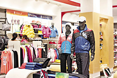 ■在福建廈門喬丹專賣店,上周仍有印著國際籃聯FIBA標誌和喬丹體育標誌的運動服「大方」展示。 香港文匯報記者葉臻瑜 攝
