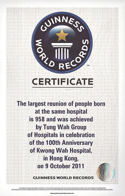 香港文匯報訊(記者 陳巧顏)東華三院日前正式接獲健力士世界紀錄大全通知,於廣華醫院百歲誕辰當天,即去年10月9日舉行的「廣華『牆』青Goal Go高」慈善步行,創造了「召集最多於同一間醫院出生的人士共聚」的健力士世界紀錄,獲頒發證書(見圖)。