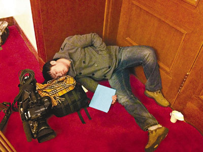 由於在外圍等候時間過長,加之「兩會」以來的勞累,一名記者席地而睡。 ■香港文匯報記者李茜婷 攝