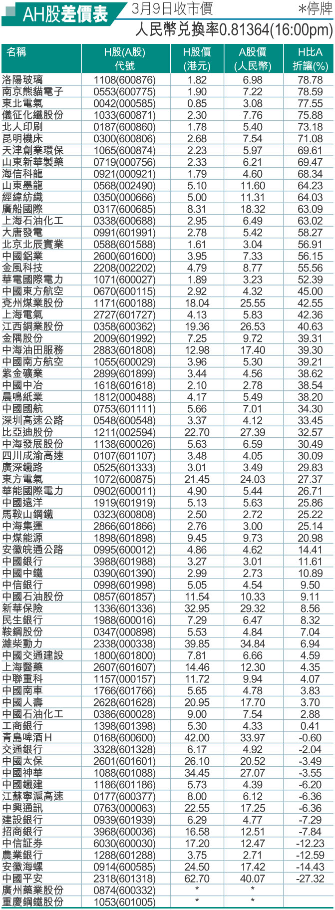 AH股差價表(3月9日收市價)*停牌 (2012-03-10) (圖)