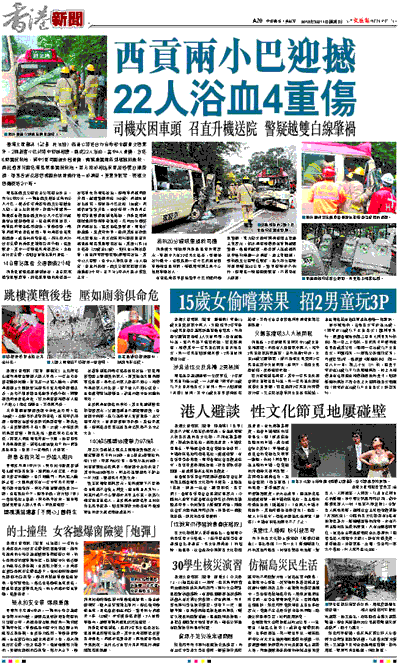 現場為西貢公路近孟公窩路白沙台。昨午3時22分,一輛由西貢開往旺角的公共小巴,載著多名乘客沿西貢公路駛往九龍,至上址對開時,對面行車線另一輛載客由觀塘往西貢的公共小巴突然越過雙白線迎頭而至,且毫無煞車跡象,兩車迅即發生猛烈迎撞,車頭盡毀,兩車司機同告重傷被困,車內乘客當場東倒西歪,或撞向椅背受傷,部分疑未扣好安全帶的乘客更拋離座椅仆倒,傷勢較重。其中一名輕傷男乘客表示,幸他有扣安全帶,否則會被拋出車外重傷。