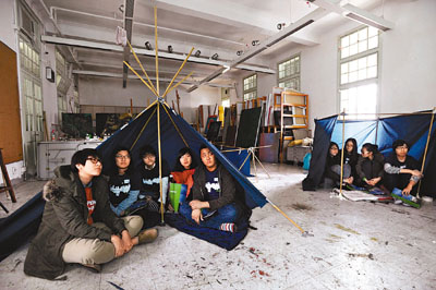 ■學生在核災演習仿災民,用紙皮區間生活空間。 相片由綠色和平提供