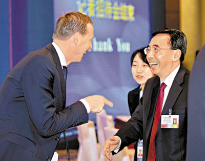 ■朱小丹和「洋顧問」就廣東轉型升級問題親切交談。