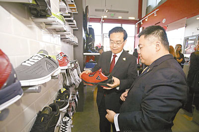 ■2012年2月,福建省長蘇樹林赴美參加中美經貿論壇和中美省州長見面會,並在美國舉行福建經貿合作推介會。圖為蘇樹林(左)參觀匹克體育全美旗艦店。 香港文匯報福建傳真