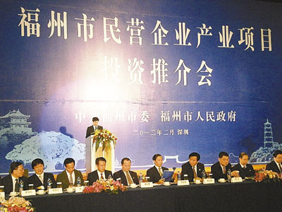 楊益民介紹了福州市經濟社會發展情況和產業項目投資優惠政策。他稱,福州市已形成了3個千億元產業集群和4個年產值超百億元企業,特別突出了福州市所在海峽西岸經濟區和平潭綜合實驗區開放開發建設發展帶來的機遇,以及兩岸簽訂實施的ECFA合作醞釀的機遇,這將為海內外投資者提供更為廣闊的發展空間。福州市將與粵港澳台開展更為廣闊的經貿文化項目合作,促進產業結構轉型升級,建立和完善現代產業結構體系。