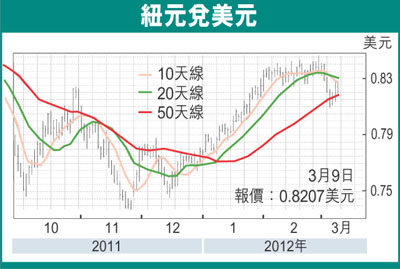 紐元上周在81.00美仙附近獲得較大支持後,已稍為作出反彈,在衝破82.00美仙水平後,更一度反覆走高至82.80美仙附近。由於美國2月份非農就業人數增加22.7萬後,該數據已是較預期為好,再加上1月份的非農就業人數又被向上修訂至28.4萬,因此當美國的非農就業人數已連續3個月均高於20萬之後,部分投資者已認為美國聯儲局將不會急於推出新一輪的寬鬆措施,該情況除了是有助美元的短期表現之外,連帶商品貨幣的升幅亦將會暫時受到一定限制,故此預期紐元將會續有反覆下調空間。