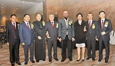 ■主禮嘉賓發展局局長林鄭月娥(右三)與客屬總會部分首長(左起)吳火豪、吳惠權、李有權、羅煥昌、何冬青、劉宇新及梁亮勝。