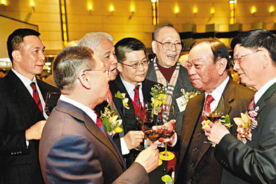 ■客屬總會榮譽主席、大紫荊勳賢劉皇發(右二)與客屬總會部分首長(左起)梁錫光、吳惠權、楊釗、曾智明、何冬青及梁亮勝。
