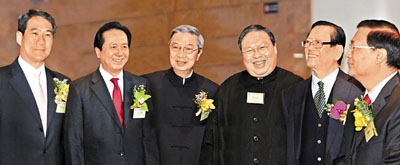(左起)鄧竟成、陳經緯、王國強、何志平、陳有慶及譚耀宗到賀。
