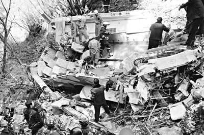 ■搜救人員在山溝下的事故現場。 新華社
