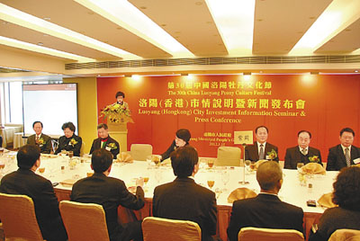 香港文匯報訊(記者 陳靜 香港報道)第30屆中國洛陽牡丹文化節「洛陽市情說明暨新聞發佈會」昨在香港舉行。洛陽市委常委、統戰部部長陳向平、洛陽商務局局長曾丹梅等領導出席,並誠邀中外嘉賓在第30屆中國洛陽牡丹文化節期間到洛陽觀光賞花。並希望這次活動能夠成為洛港加深合作、增進友誼的平台,成為海內外客商了解洛陽、共謀發展的橋樑。