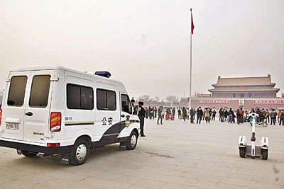 ■天安門廣場前,公安警車正在執勤。 李茜婷 攝