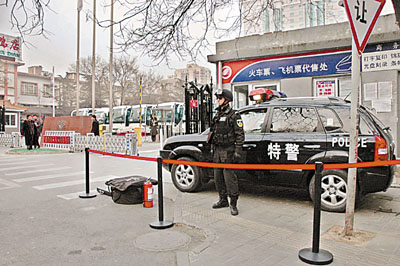 ■兩會駐地—鐵道大廈前,早已有特警把守。 王添翼 攝