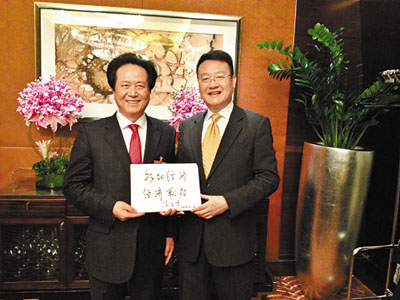 全國政協委員、香港經緯集團董事局主席陳經緯為朝陽題辭,並與朝陽區投資促進局局長馬英暉合影。左為陳經緯,右為馬英暉。 王添翼 攝
