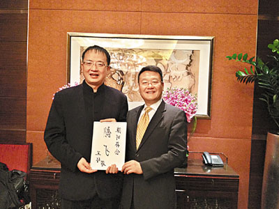 香港亞視投資人王征為朝陽題辭,並與朝陽區投資促進局局長馬英暉合影。左為王征,右為馬英暉。 王添翼 攝