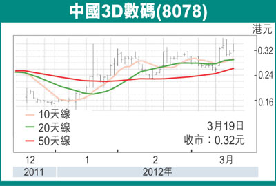 中國3D數碼自配股後股價持續躍升,相信與投資者看好其業務前景及將收購影院資產有關,在好消息未落實前,遇調整不妨收集。