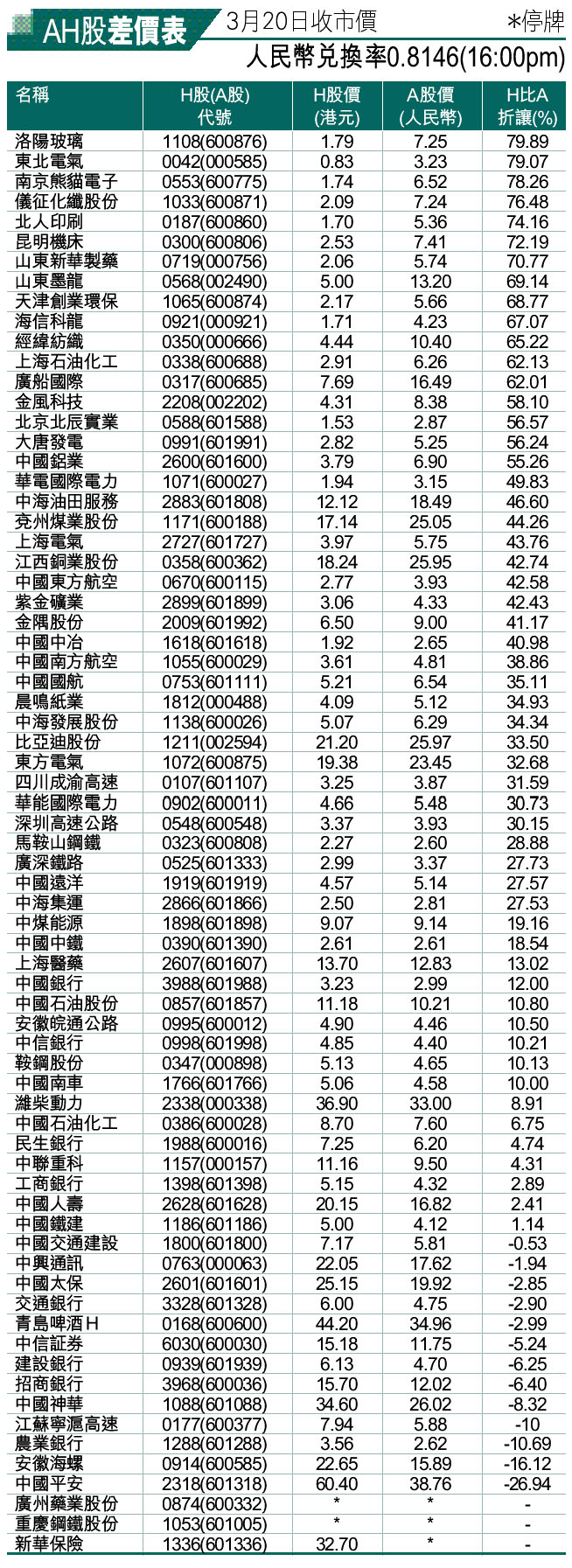 AH股差價表(3月19日收市價)*停牌 (2012-03-20) (圖)