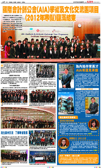 國際會計師公會(AIA)亞太區區域總監彭子堅表示,AIA從2006年開始主辦「AIA學術及文化交流團項目」,目的是加強內地、本港和澳門三地高等院校學生在國際會計、財務及管理方向的學習及文化交流。由於項目內容相當充實及有啟發性,學生獲益匪淺,而校方也給予交流團項目正面評價,並授予學分。AIA吸取過往經驗已開辦寒假及暑假團, 以便滿足不斷增加交流學生數目。