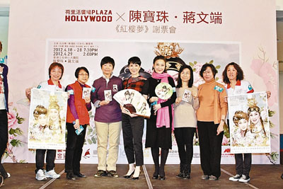香港文匯報訊 (記者 梁靜儀) 陳寶珠(見圖)與蔣文端合演的《紅樓夢》自開售以來反應熱烈,二人昨日出席謝票會,並宣佈加開28、29號兩場,合共演出12場。寶珠姐又大爆兒子天經將於7月補擺結婚酒。昨日在答謝會上,寶珠姐與戲迷大玩遊戲,玩得投入的她更笑指戲迷「水皮」。問到會否再加場?寶珠姐笑說:「唔夠喉咪第二日再做過。(開Part 2?)戲院及阿端個期好難度。」問寶珠姐平日可會跟兒子談政治?她卻一時口快爆了兒子婚宴日期:「係傾都傾天經7月擺酒的事。(會否豪搞?)大家開心啦,至緊要個仔、新抱開心,因為得一粒仔,會擺幾十圍。」
