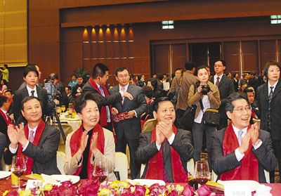 ■會上,獨具黑龍江特色的表演引來眾人陣陣掌聲。圖為黑龍江副省長孫堯(左一),中聯辦副主任郭莉(左二),黑龍江省長王憲魁(右二),香港商務及經濟發展局局長蘇錦樑(右一)。 香港文匯報記者張偉民 攝