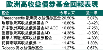 以佔今年來榜首的Threadneedle 歐洲高收益債券基金為例,主要是透過不少於二分之一資產投資於具投機評級的歐洲定息證券,以達致利息收入為主的全面回報組合。