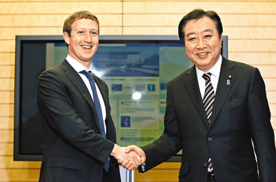 社交網站facebook創辦人朱克伯格在中國度假後,昨日到訪日本並與首相野田佳彥會面,二人談及fb協助去年東日本大地震救災。野田更坦言能親身接觸電影《社交網絡》的真實人物感覺有趣,朱仔則笑言電影角色與現實「差得遠」。