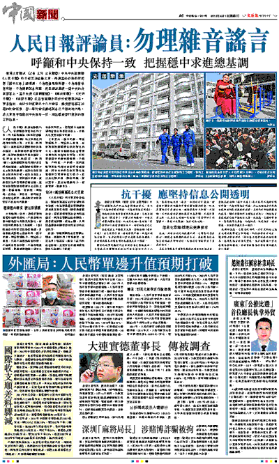 香港文匯報訊(記者 王玨 北京報道)中共中央機關報《人民日報》昨日發表評論員文章,強調當前必須牢牢把握「穩中求進」總基調,不為困難風險所懼,不為雜音噪音所擾,不為傳聞謠言所惑,把思想認識統一到中央的決策部署上。當日央視《新聞聯播》、《解放軍報》、《光明日報》、《經濟日報》及各省黨報亦同步刊發這篇評論。學者指出,由於今秋將舉行十八大會議,需要營造穩定和諧的社會氣氛,但一些社會及網絡謠言已干擾政治大局。該文章是呼籲應和中央保持一致、相信權威部門提供的確定性信息。