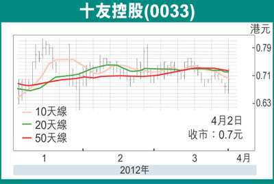 十友控股(0033)昨回落至0.66元的上周五低位支持後,於午後尾市曾湧上0.73元,收市報0.7元,仍升0.02元或2.94%,成交613萬元,已較上周五增近2倍,該股似漸見熱身,不妨考慮續盯緊。